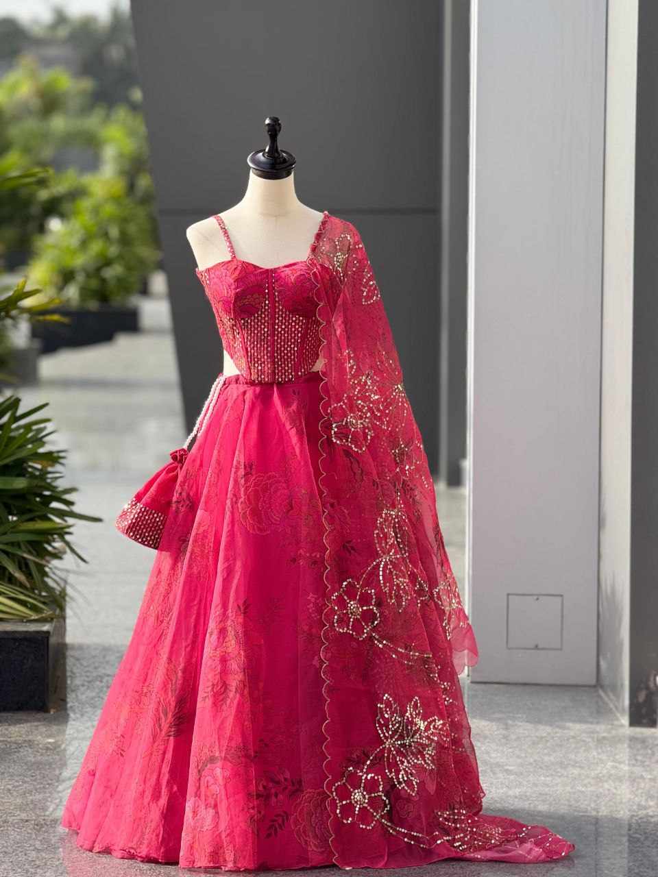 Lehenga – Pure organza digital printed lehenga with a grand 8-meter flair, featuring canvas patta, can-can, and adjustable waist dori
